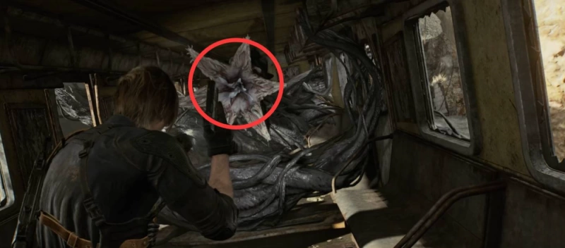 Enter the derelict train car to trigger the first encounter. Plant 43's spawnling bursts through the wall with vines flailing.