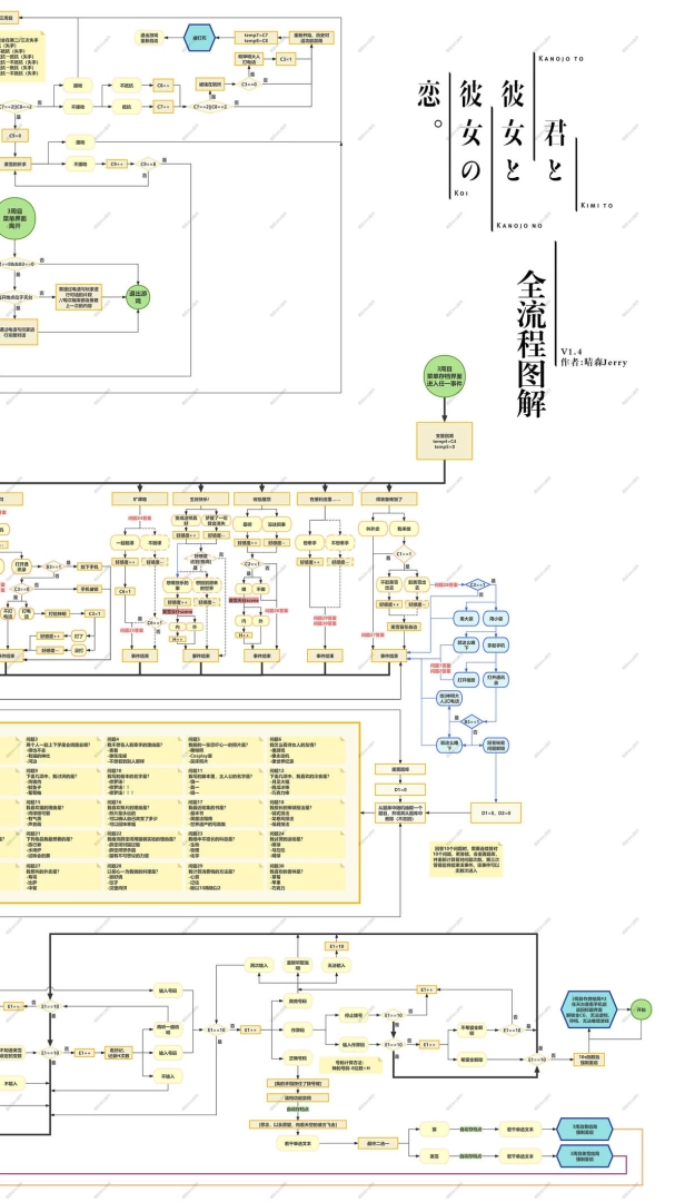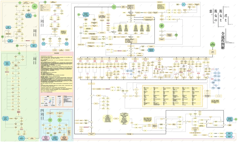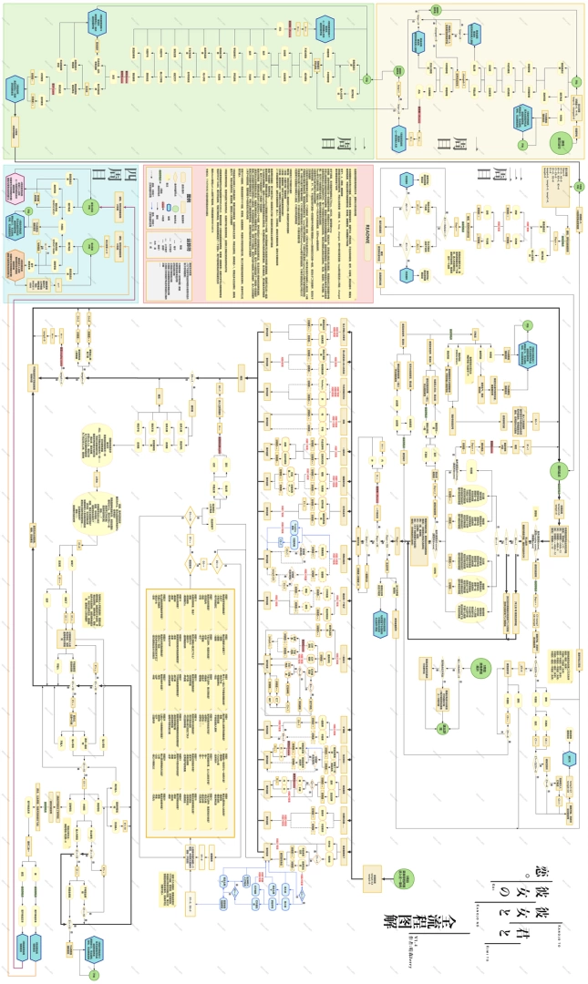 The worst part about playing *Kimi to Kanojo to Kanojo no Koi* (Totono) is getting stuck in the infinite loop of the third playthrough—one wrong choice and you're back to square one. I've been there, and it sucks. This guide took me a full week to put together. I walked through every single option and every route, mapping out the dimensional prison loop mechanics of the third playthrough completely. The escape mechanics, auto-save points, and all H-scene trigger conditions are organized in this flowchart. Follow it, and you won't get stuck.
