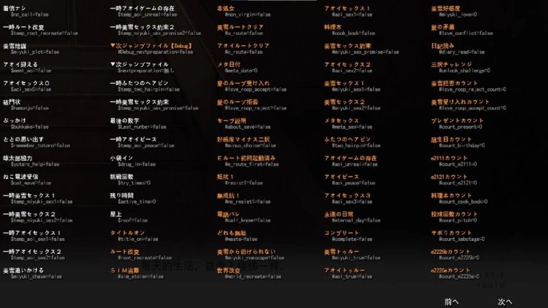 When the game launches for the first time, it creates a save file and defines global variables: Affection, H, Loop, and Changed. "H" represents the Miyuki variable. "Loop" indicates whether you've entered the second playthrough. "Changed" indicates whether Aoi has changed the world.