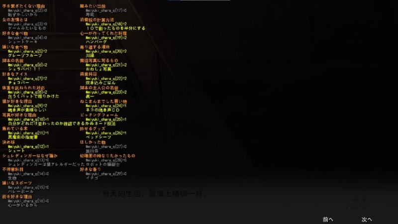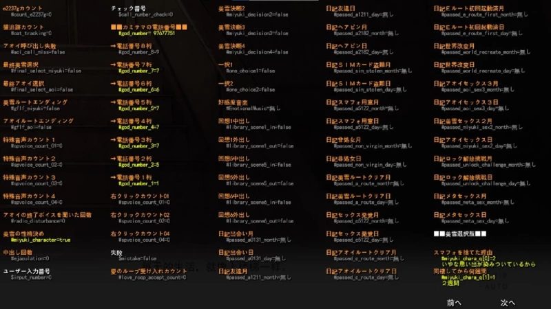 2. Days: Used to record the number of loop days. Can trigger story routes for [One Week], [One Month], and [Half a Year]. Note the timing of when Days increments.